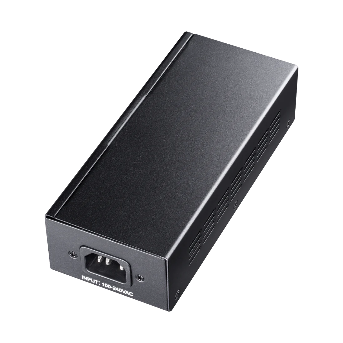 კედელზე დამაგრებული ლითონის გარსაცმის PoE ადაპტერი, რომელიც 60 ვტ-მდე სიმძლავრის ინექციას აძლევს Ethernet კაბელს PoE მოწყობილობის გასააქტიურებლად.